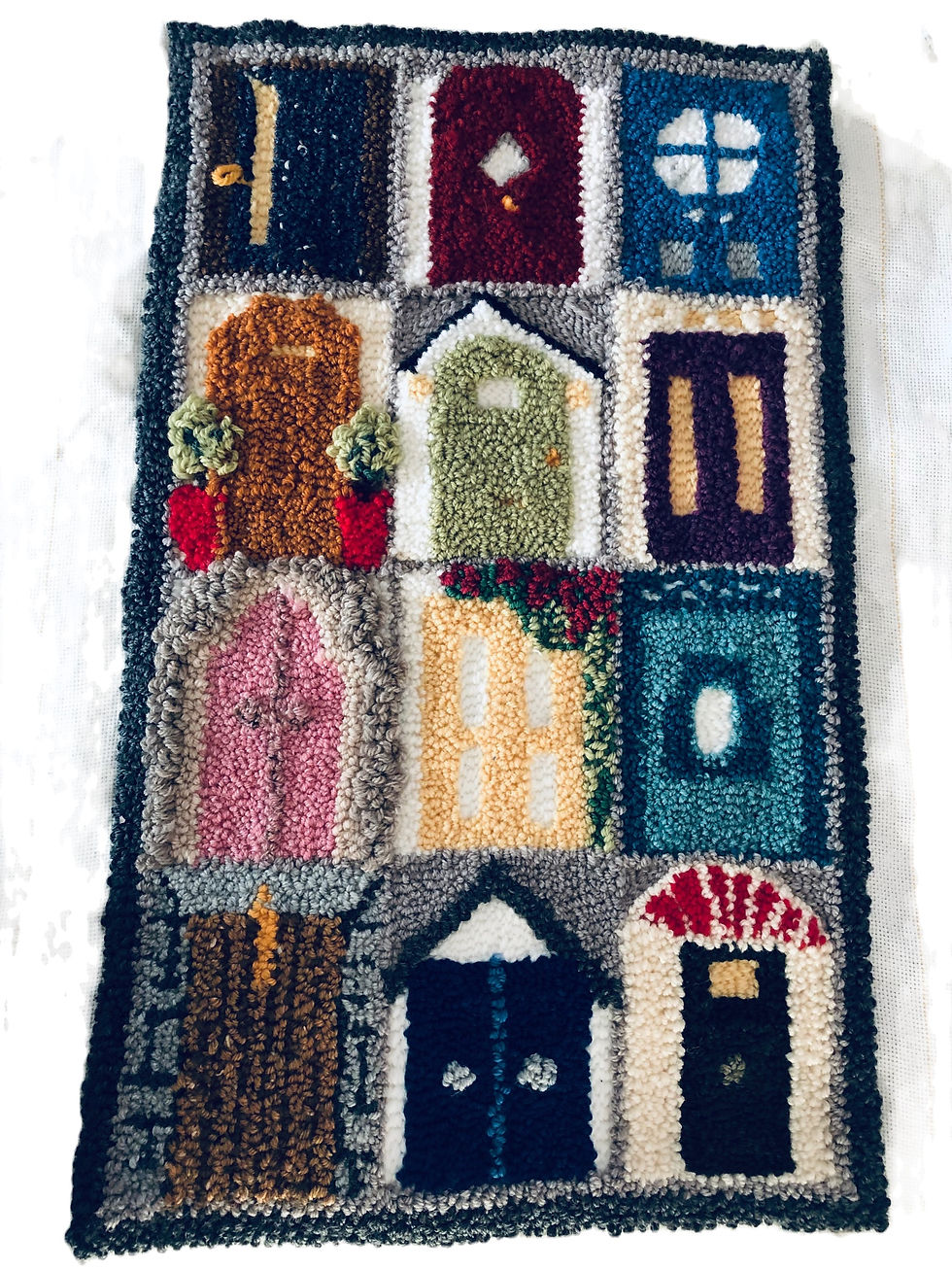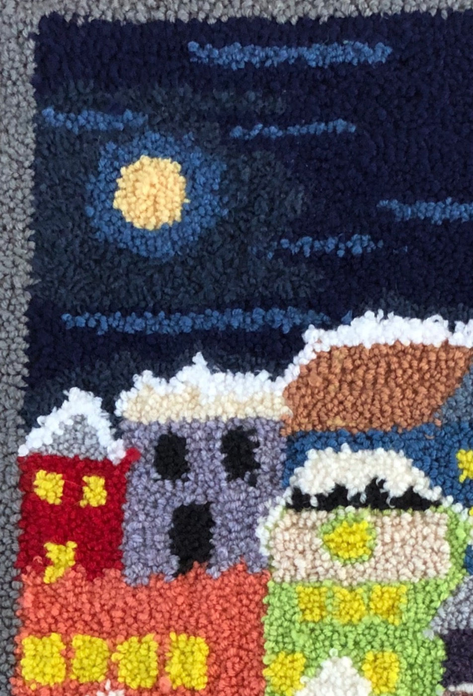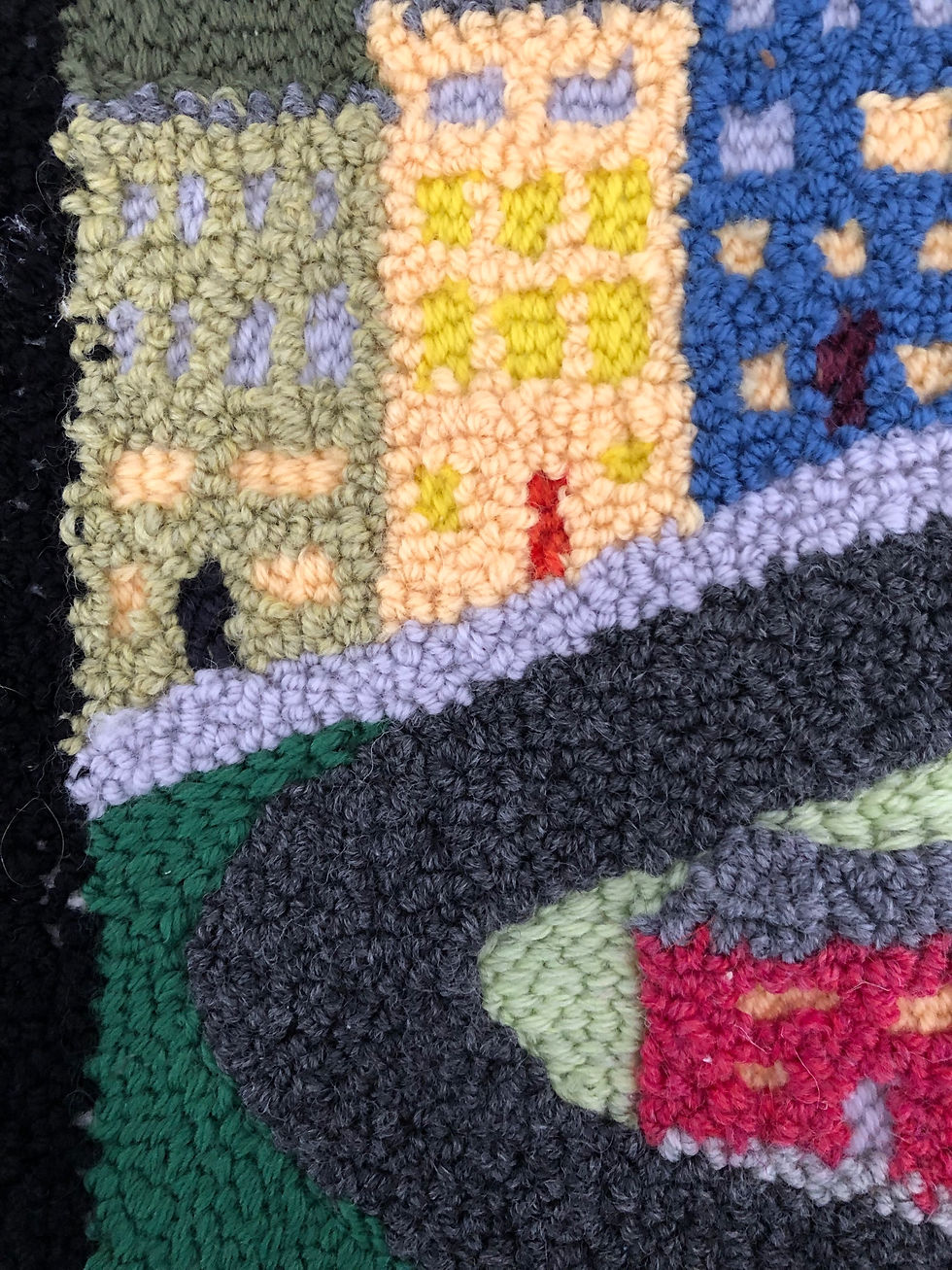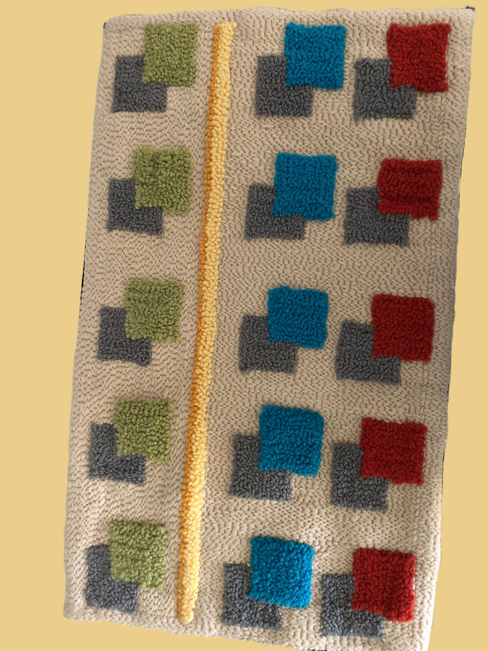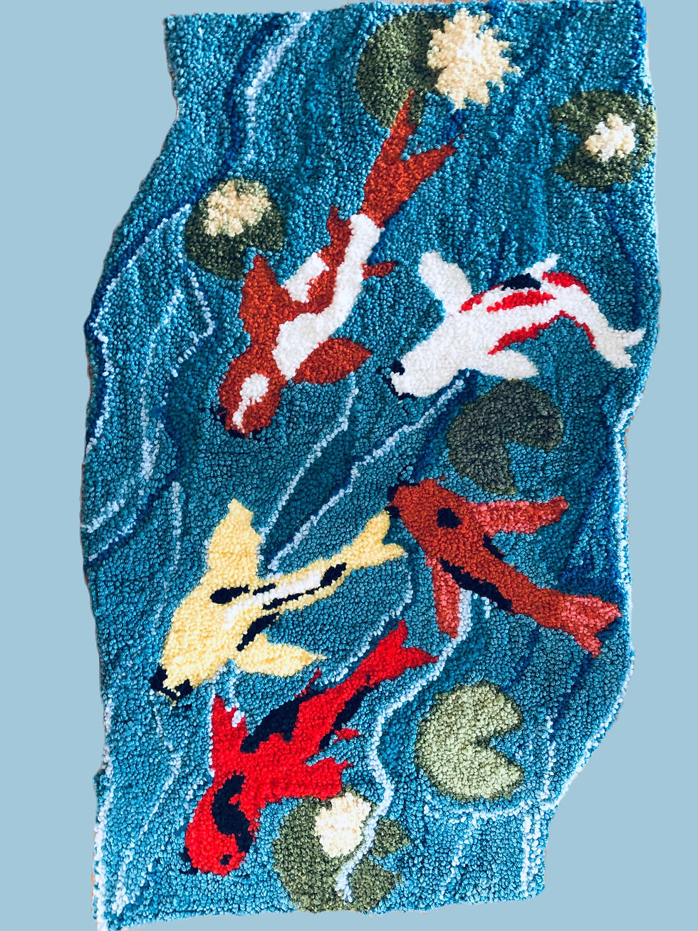 Hand tufted using punch needle technique with 100% wool and either mounted on canvas or wood, or framed. Also tapestries that can be used as wall art or small scatter rugs.